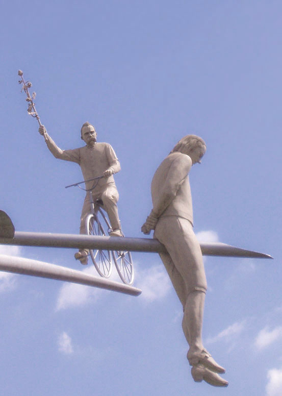 To be sure, I found none of these recent representations more disturbing that the poet's earlier manifestation in 2003 in the center of a traffic roundabout in Lauffen. While Friedrich Nietzsche orbits about him on a bicycle, the poet ponders the likelihood of his imminent castration at the point of an oversized writing implement.
