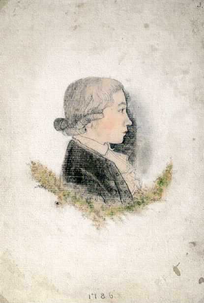 This pencil drawing with coloring added was done in 1786, possibly by a fellow scholar at Maulbronn. His hair has been neatly curled, and the profile of the budding poet rests on laurel branches. He had begun writing poems by age 14. Württembergische Landesbibliothek Stuttgart.