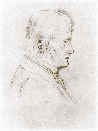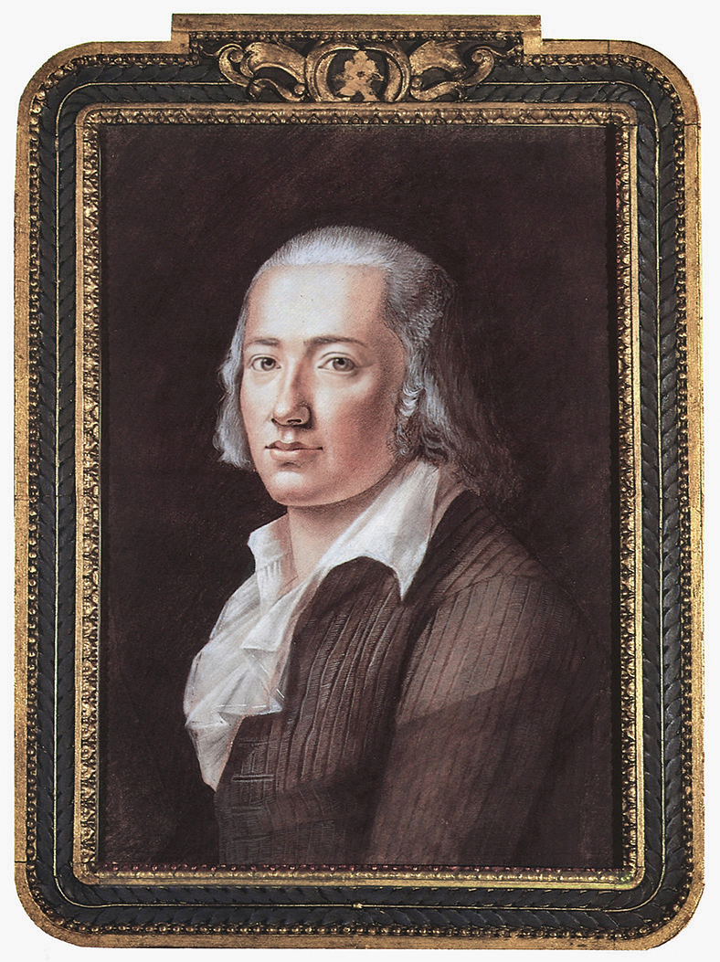 Pastel drawing by Franz Karl Hiemer of the poet at age 22, his hair powdered and wearing a quilted jacket, around the time of receiving his Magister degree from the seminary college in Tübingen. This is the gold standard of Hölderlin portraits and is automatically reproduced almost anywhere his name is mentioned in print. It suffers from the one deficiency that his sister is recorded as saying, perhaps jokingly, that it doesn't look like him. Bildarchiv Preussischer Kulturbesitz.